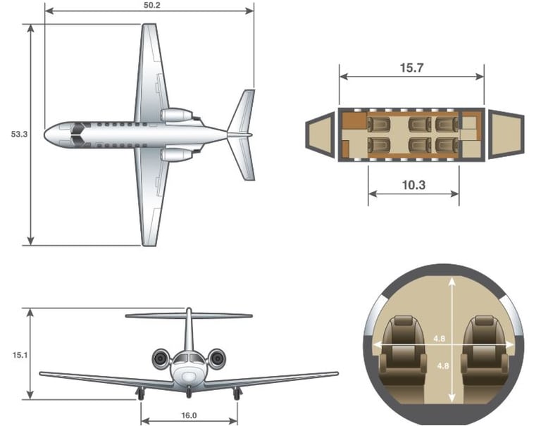 The CJ3 is a CJ2 with a two-foot stretch to the cabin length. The aircraft can seat between 6-7 depending on the configuration, with the 7th seat side-facing near the front entrance door. The Citation CJ3+ is basically the same as the CJ3 except the CJ3+ comes with advanced cockpit technology and all new cabin layout.